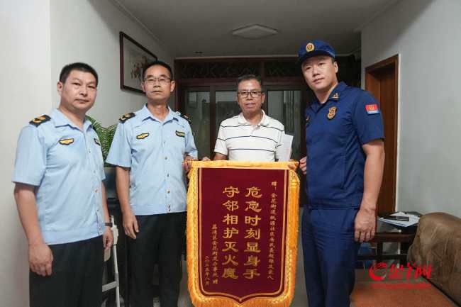 广州65岁阿叔隔空灭火收到感谢信善举获赞。近日,广州市荔湾区65岁的退休阿叔聂超雄与家人“隔空灭火”的事迹温暖了许多街坊,大家纷纷称赞他是“中国好邻居”。9月1日下午,荔湾区消防救援大队与金花街道工作人员一同上门,为聂叔送上了感谢信和慰问金。羊城晚报记者独家记录了这一温馨时刻,并重返火灾事发小区,采访多位亲历者,全景还原这场老旧小区中的灭火救援过程。
